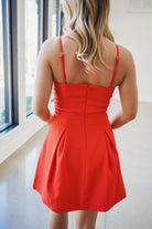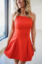 Elevate your wardrobe with the Jen Mini Dress, a striking tomato red piece that commands attention. This sleeveless design features a flattering pleated a-line silhouette that moves beautifully with you, while the straight square neckline offers a modern, sophisticated edge. The open back detail adds an unexpected allure, seamlessly finished with an invisible back zipper for a polished look. Perfect for date nights, cocktail events, or whenever you want to make a bold statement. Versatile enough to dress up or down, this mini dress is an essential addition to any fashion-forward closet!