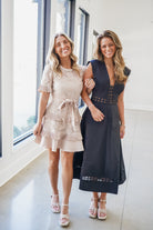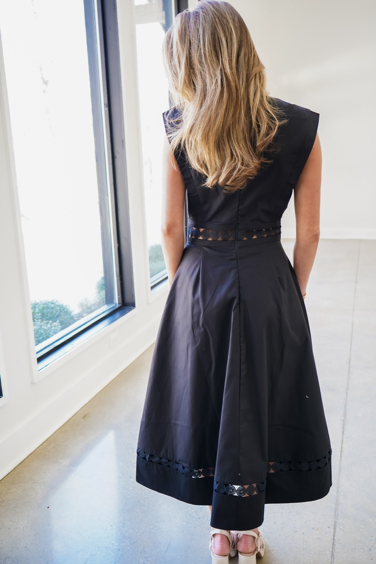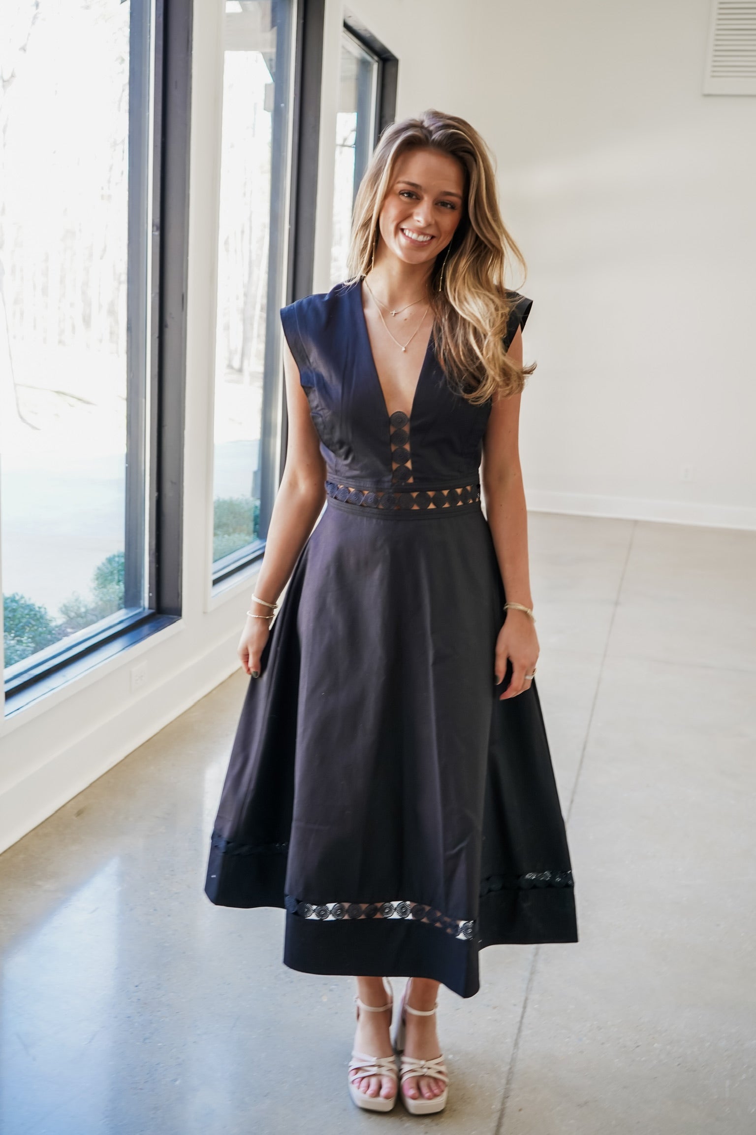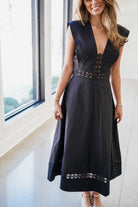 Elevate your wardrobe with the Kendra Midi Dress, a sophisticated piece that effortlessly transitions from day to night. This sleek black midi features a flattering V-neckline and graceful A-line silhouette that skims beautifully over your curves. The intricate embroidered cutout design adds an unexpected touch of elegance and visual interest, while the convenient back zipper ensures a smooth, polished fit every time. Perfect for cocktail events, dinner dates, or elevated casual occasions, this versatile dress delivers timeless style with modern flair.