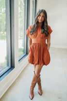 Step into fun and flair with the Miley Mini Dress. This rust orange beauty features playful cap sleeves and a flirty bubble hem that adds bounce to every step. The wide waistband highlights your silhouette, while the back zipper ensures a perfect fit. Perfect for turning heads and making memories!