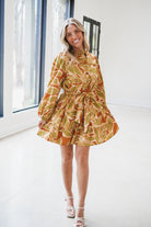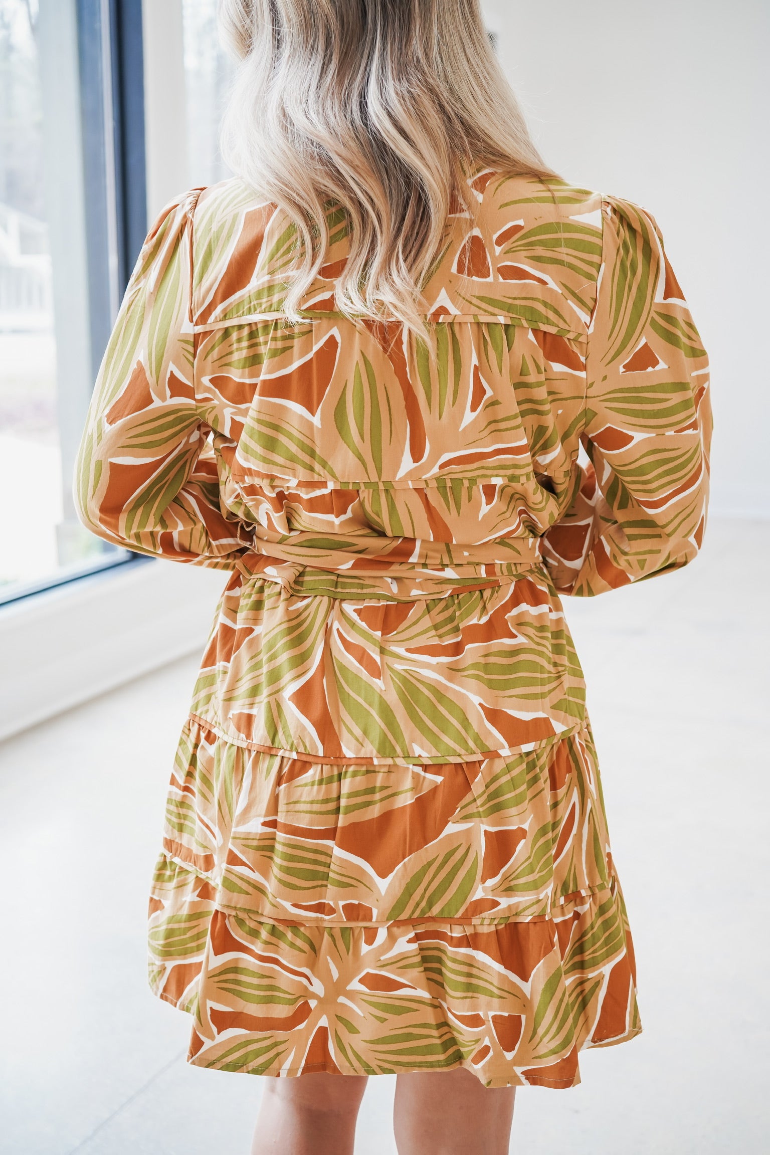 The Payne Mini Dress combines effortless style with thoughtful design details. Featuring voluminous balloon sleeves and a vibrant orange and green desert palm print, this piece makes an instant statement. The full front button closure allows for easy styling versatility, while the tiered skirt adds dimension and movement. A coordinating waist tie belt defines your silhouette and enhances the dress's flattering proportions. Perfect for warm-weather occasions, this mini dress transitions seamlessly from day to evening wear.
