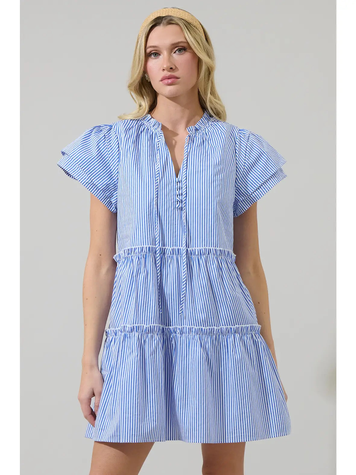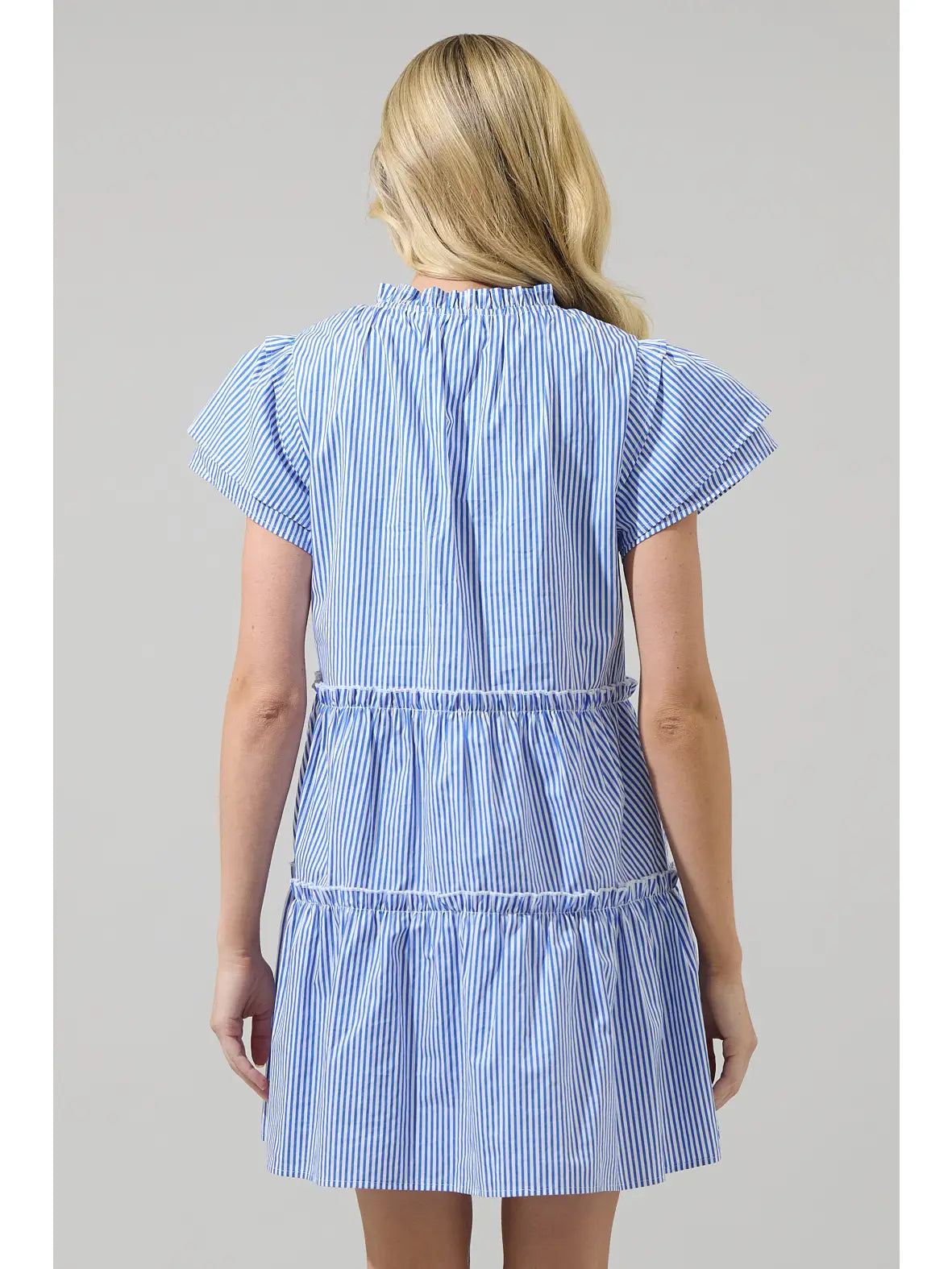 Perfect for casual outings or sunny days, it offers a breezy, comfortable look with just the right touch of stripes! This flirty woven mini dress features a split neckline and short sleeves with ruffle layers. Fitted waist is accented with decorative tiers of ruffle trim that accent the flaring mini skirt below. Wear some heels to complete the look.