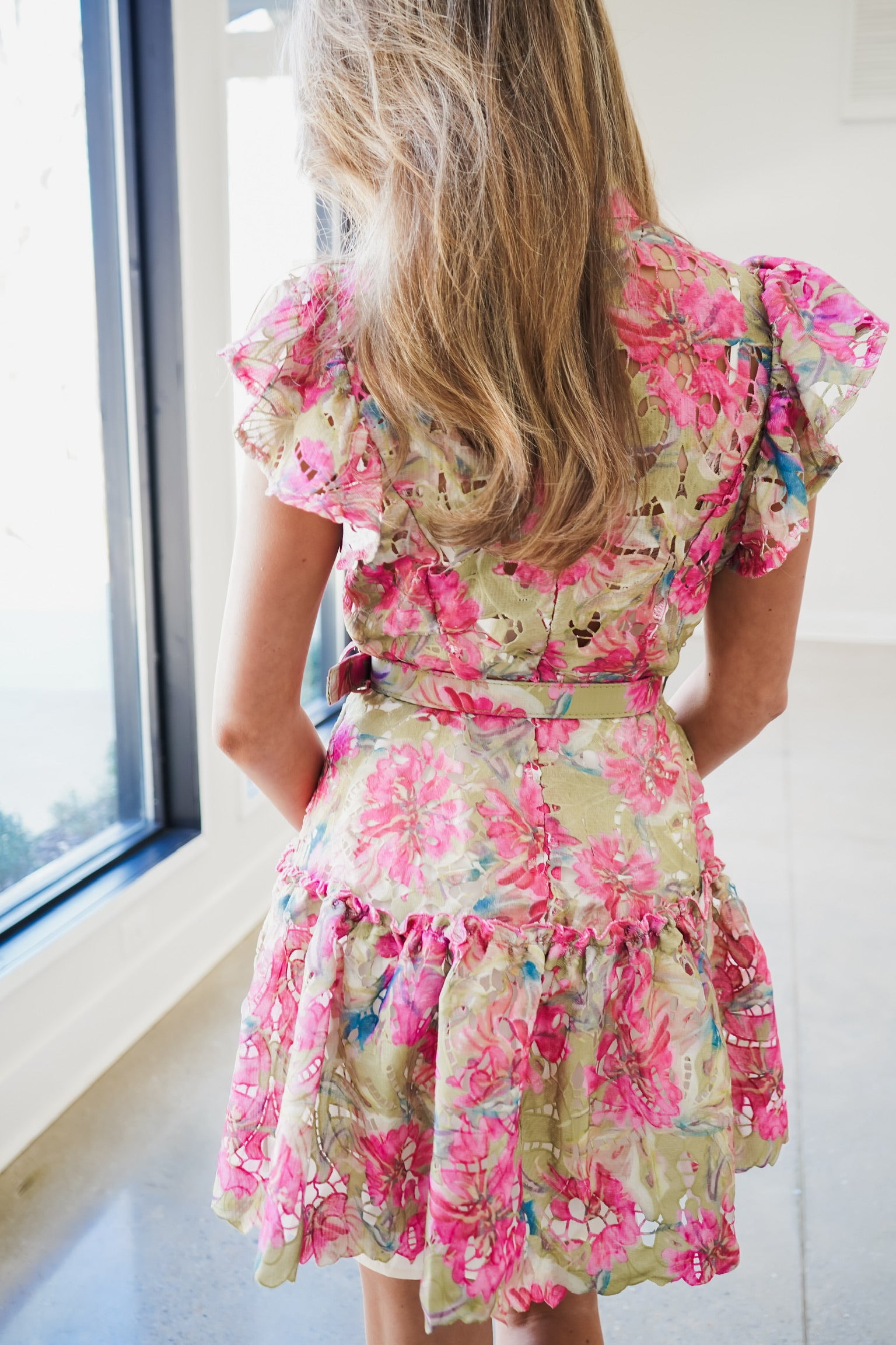 The Whitni Mini Dress combines romantic details with polished sophistication. This piece features a striking green and pink floral print that commands attention, while flutter sleeves and a high collar neckline create an elegant silhouette. A full front button closure allows for effortless styling versatility, while the belted waistline defines your figure with precision. The ruffled mini skirt adds playful movement, complemented by delicate eyelet detailing throughout. Perfect for elevated casual occasions or garden-inspired events, this dress balances feminine charm with contemporary design.