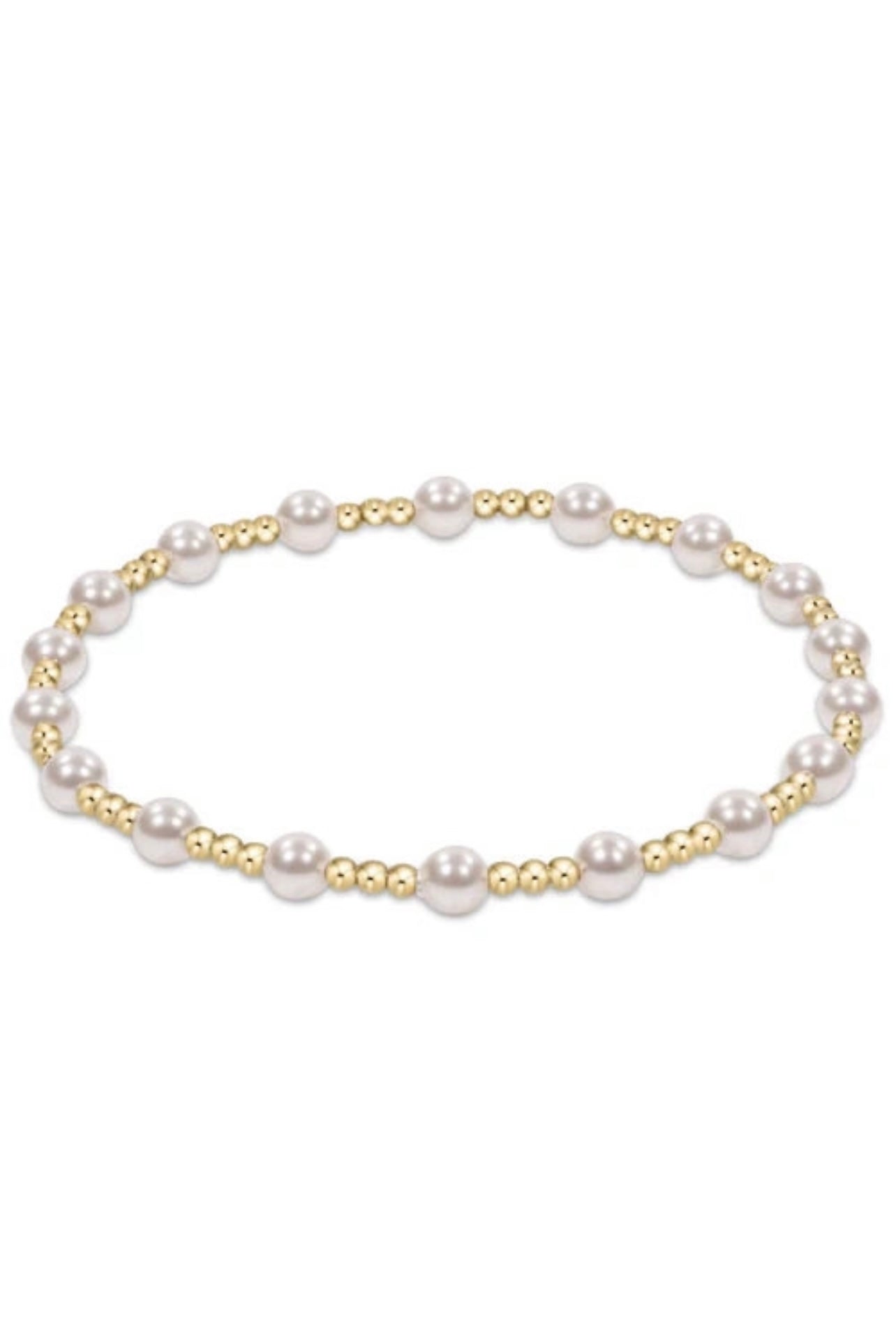 You will fall in love with this classic sincerity pattern 4mm bead bracelet with pearl! This bracelet is a classic gold beaded bracelet with alternating bead sizes. The larger bead size is a 4mm crystal pearl and the smaller bead size is a 2mm.