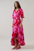 Turn heads effortlessly in the Abelia Maxi Dress - Cherry/Pink. Playful flutter sleeves frame a wrap-style bodice that ties at the waist, creating a flattering silhouette. The hi-low skirt with ruffle detail adds a flirty, flowing touch to your every step. Perfect with strappy heels, this dress lets you dance through any occasion with graceful charm.