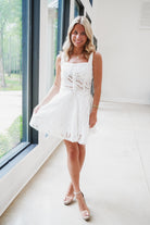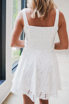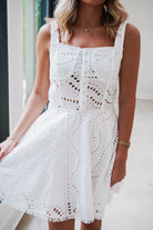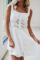 Flirty and fabulous, this white Alberta Mini Dress features delicate crochet eyelet detailing throughout. The sleeveless silhouette with wide shoulder straps offers comfortable support, while the cheeky waistband cut-out adds just the right amount of sass. A smocked back panel ensures this mini hugs your curves in all the right places. Perfect for sunny days and warm nights when you want to turn heads!
