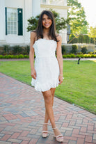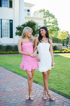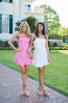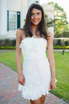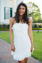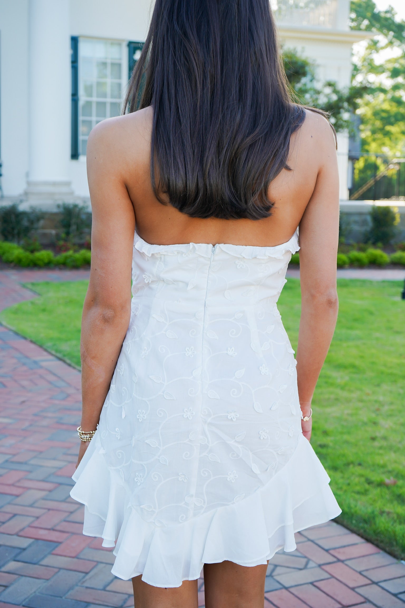 Turn heads in our Amelia Mini Dress! This white strapless and sleeveless dress features a beautiful embroidered floral vine pattern that is sure to make a statement. Perfect for any occasion, this mini dress will have you feeling confident and stylish.