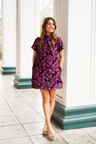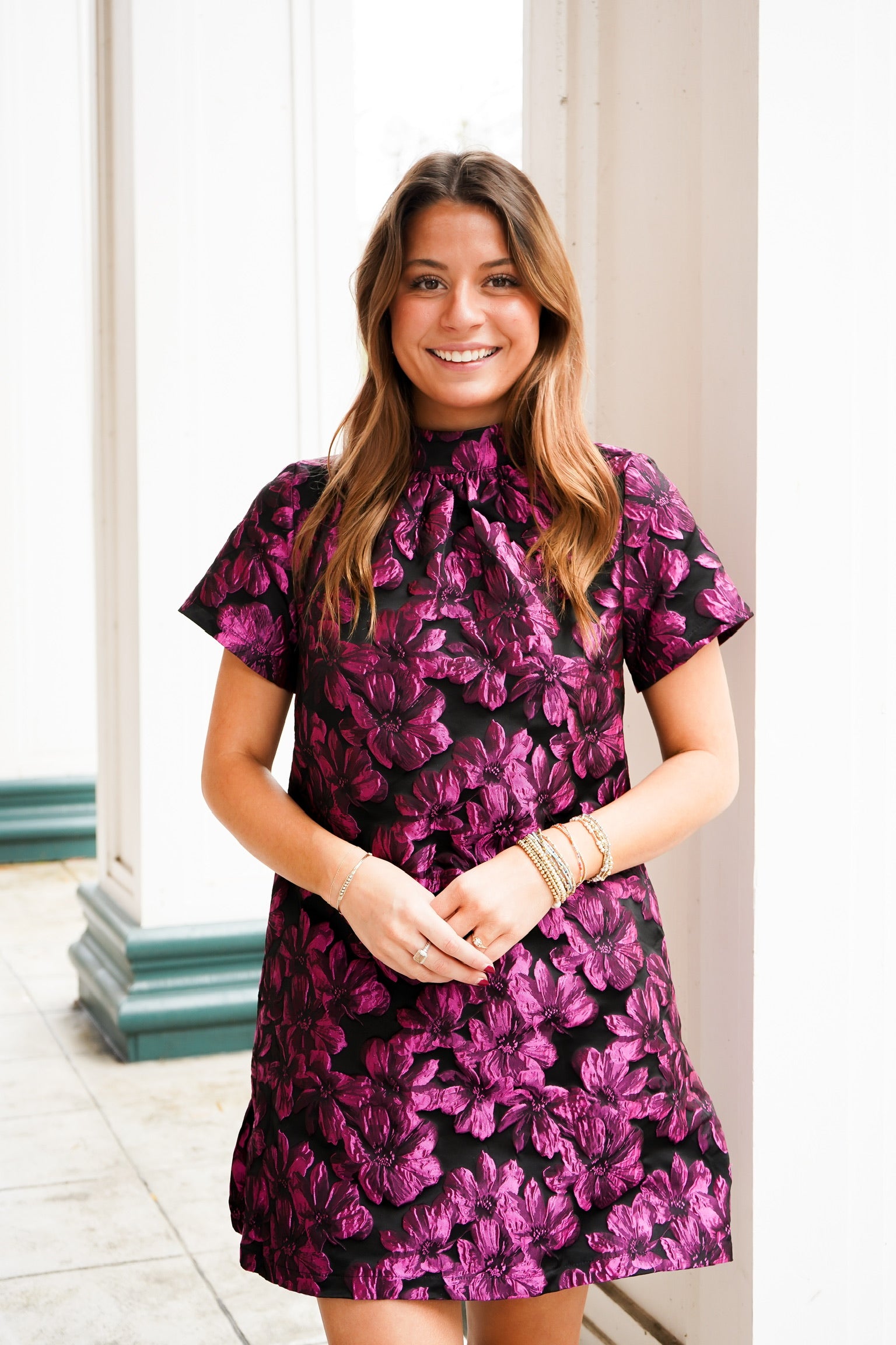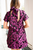 Get ready to make a statement with the Bethann Dress! This playful shift dress features a pink fuchsia and black floral printed jacquard texture, perfect for adding some fun to your wardrobe. The high ruffle cowl neck adds a touch of elegance while the side pockets and open back with back bow detail add functionality and flair. Don't miss out on this unique dress!