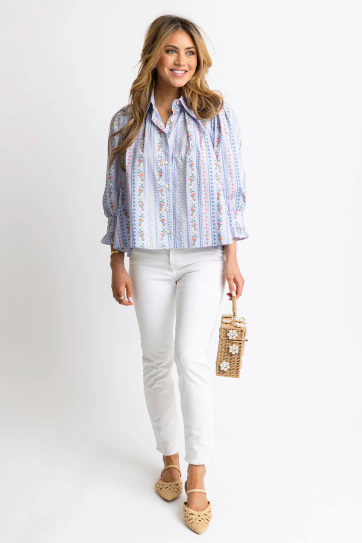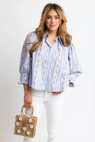 This periwinkle blouse bursts with playful charm featuring a delicate vine floral print and a classic collared neckline. Slightly cropped with ruffle cuffed sleeves, it adds a flirty touch to your look. Full pearl button closure brings an elegant shine, making this top perfect for mixing feminine style with a fun, modern twist.