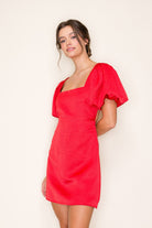 The Callista Dress in vibrant red features billowy puff sleeves and a chic open back that perfectly balance glamour and fun. This mini dress adds a playful touch to your wardrobe while keeping you effortlessly stylish for any occasion.