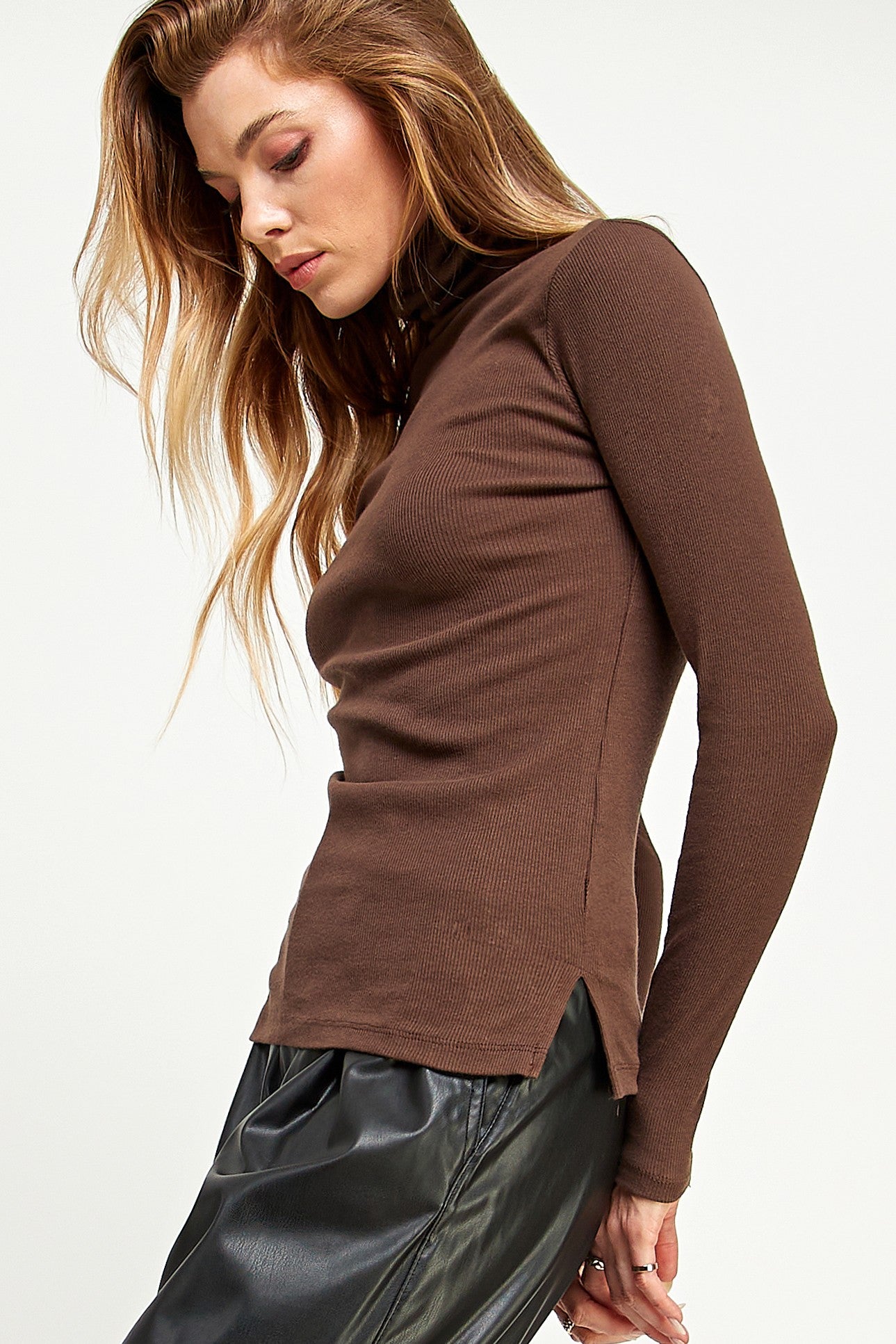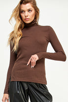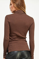 The Camryn Top in rich chocolate is a playful twist on a classic ribbed turtleneck. Its snug fit and soft texture make it the perfect base for layering or shining on its own. Cozy, chic, and ready to add a fun touch to any outfit!