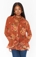 Take a walk on the floral side with the Carmela Top! This bold blouse features a garden harvest print and a relaxed fit, adding the perfect pop of pattern to any outfit.