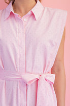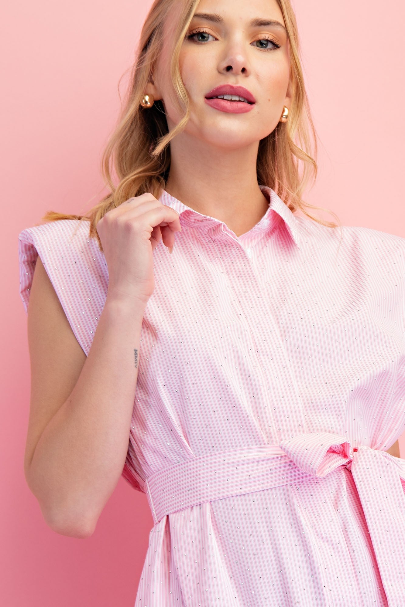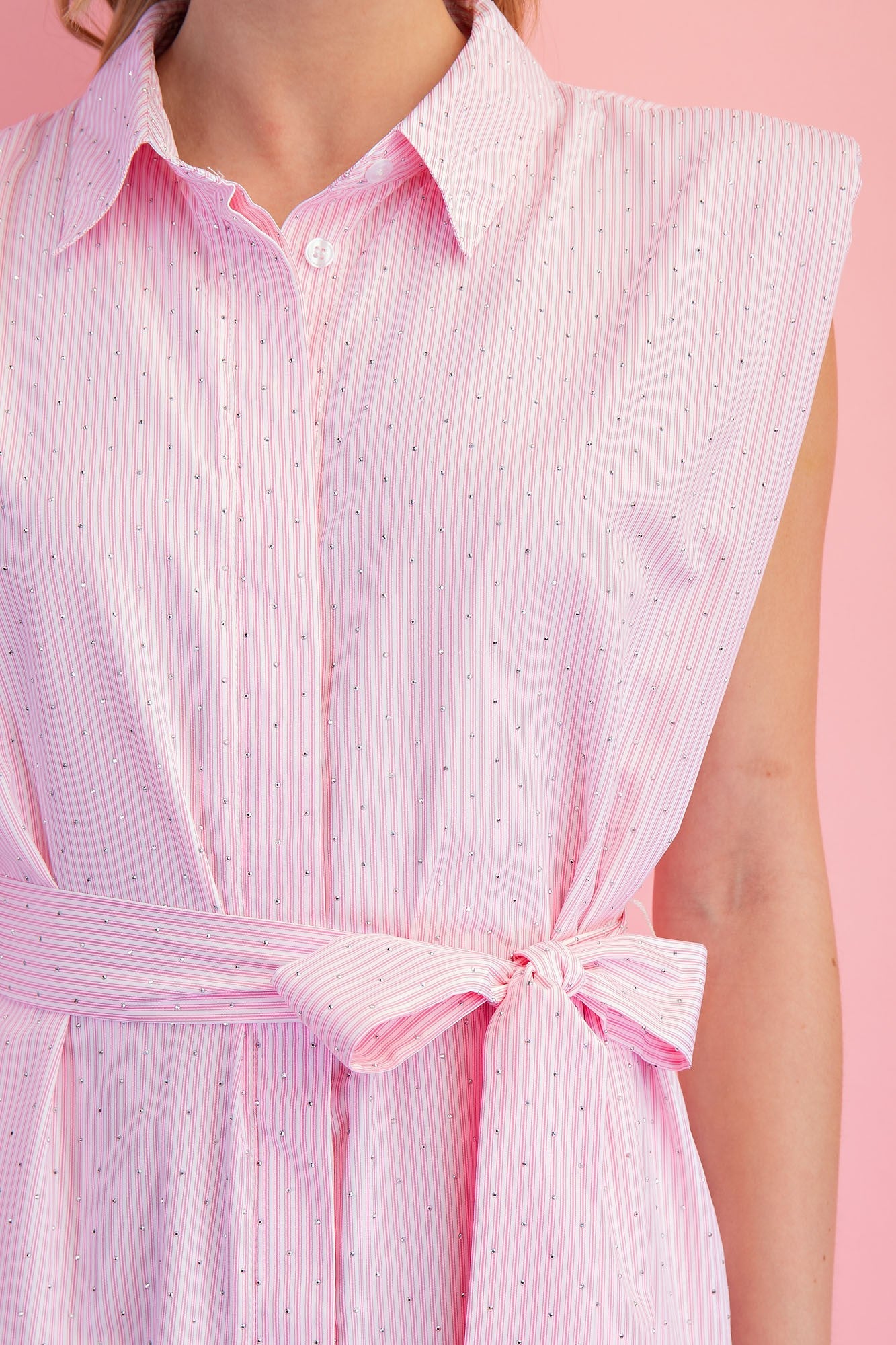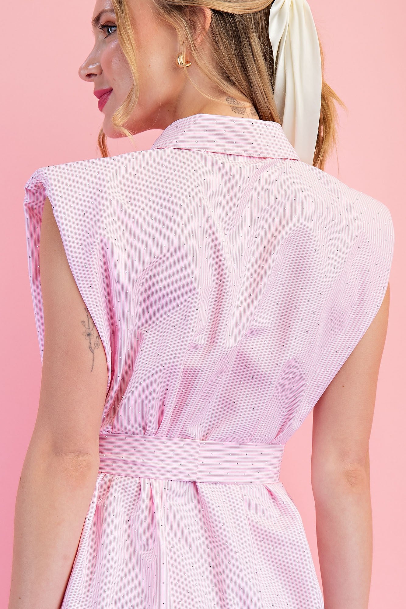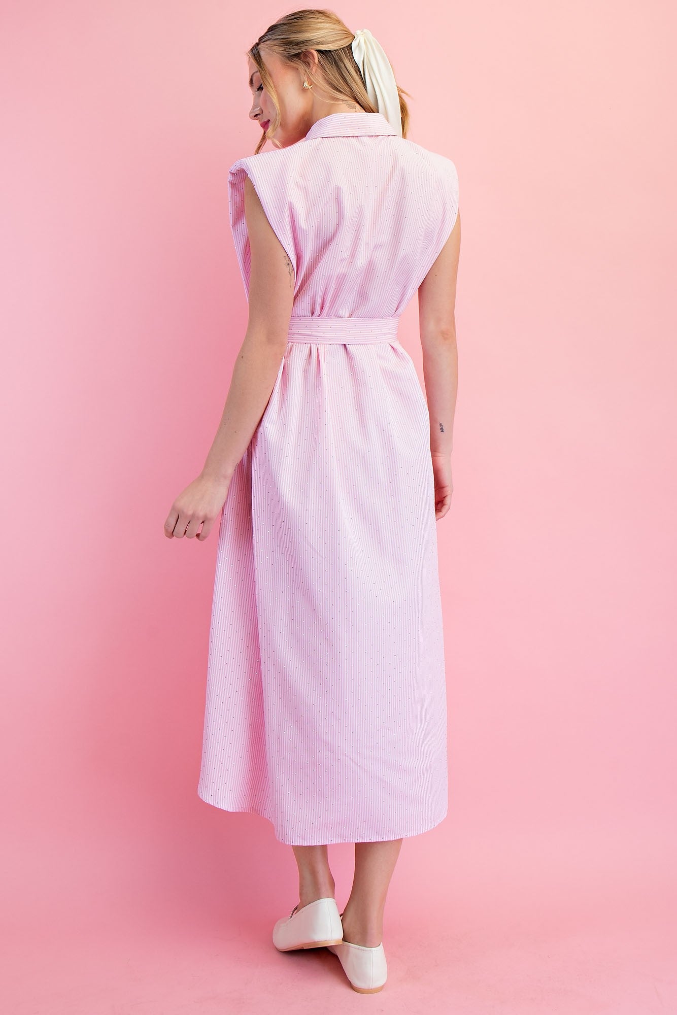 This sleeveless baby pink midi dress brings a playful charm with its delicate pinstripe print and chic collared neckline. The belted waistline flatters your silhouette while handy side pockets add a touch of practicality. Subtle silver rhinestone beaded studs give just the right amount of sparkle to brighten your day. Perfect for twirling into fun and flirty moments with effortless style.