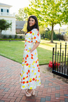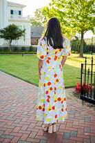 Get ready to turn heads in the vibrant and playful Coralie Maxi Dress! This maxi dress features a colorful pastel mosaic print, complete with a knot detail and bodice keyhole, puff sleeves, and a v-neckline. With a back zipper for easy wear and a bold abstract polka dot print in shades of purple, blue, green, white, orange, and yellow, this dress is the perfect mix of fun and fashion.