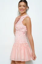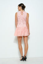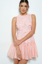 Step into summer fun with the Corey Mini Dress in pink! This sleeveless beauty features a charming round neckline and an allover floral lace pattern adorned with delicate 3D flower accents. The fitted bodice highlights your shape, while the flowy, tiered mini skirt adds a flirty bounce with every step. Perfect for day to night adventures, this dress blends intricate lace detail with a light, playful vibe.