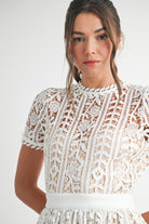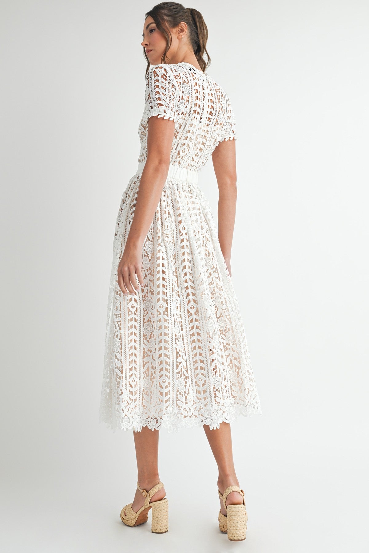 This white lace dress features a back zipper closure and is fully nude lined for added comfort and structure. The combination of these thoughtful details enhances the dress's elegant silhouette while ensuring a smooth and polished fit. Perfect for bridal or any special occasion, it offers both style and practicality