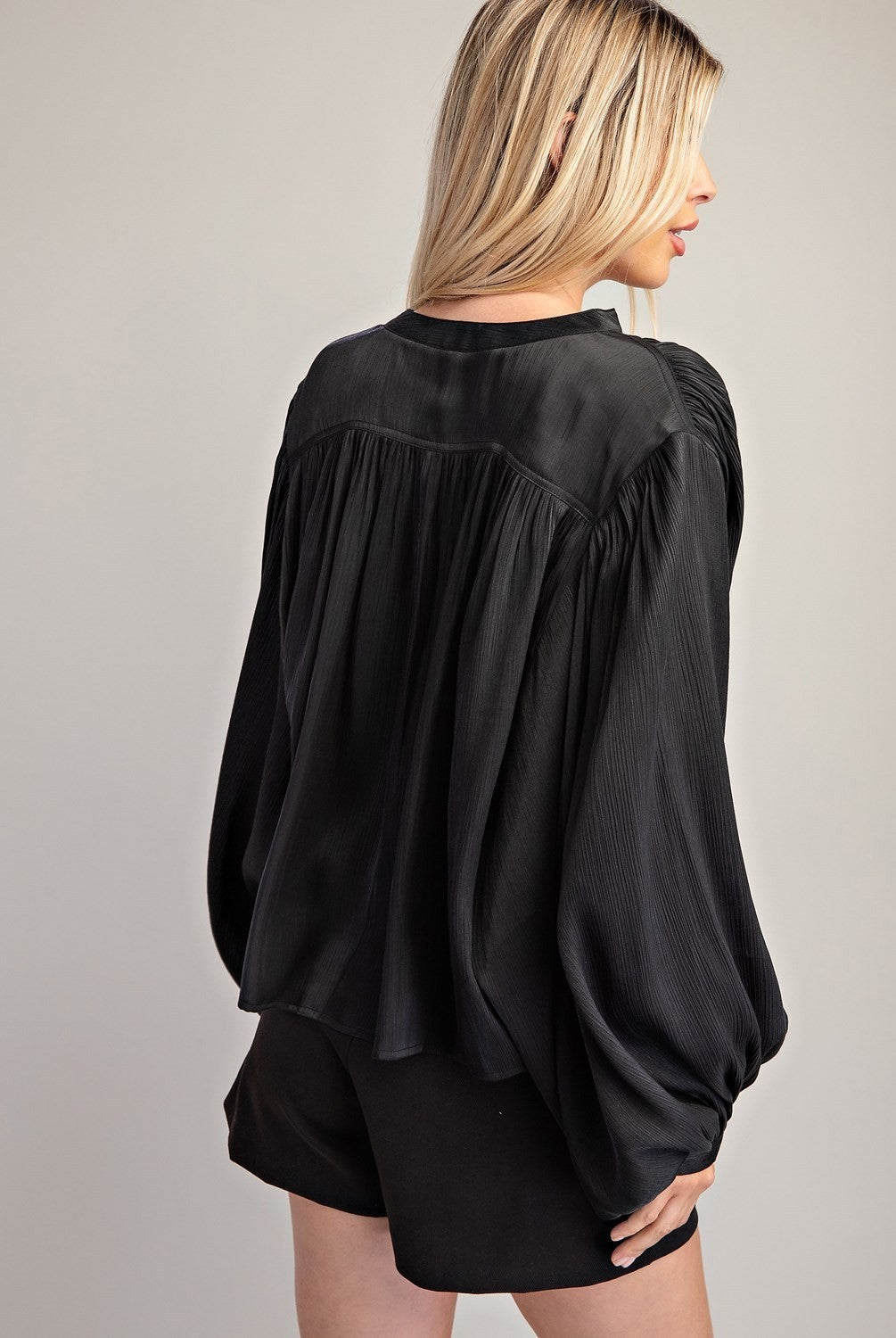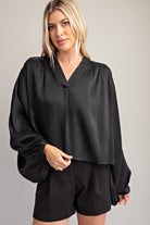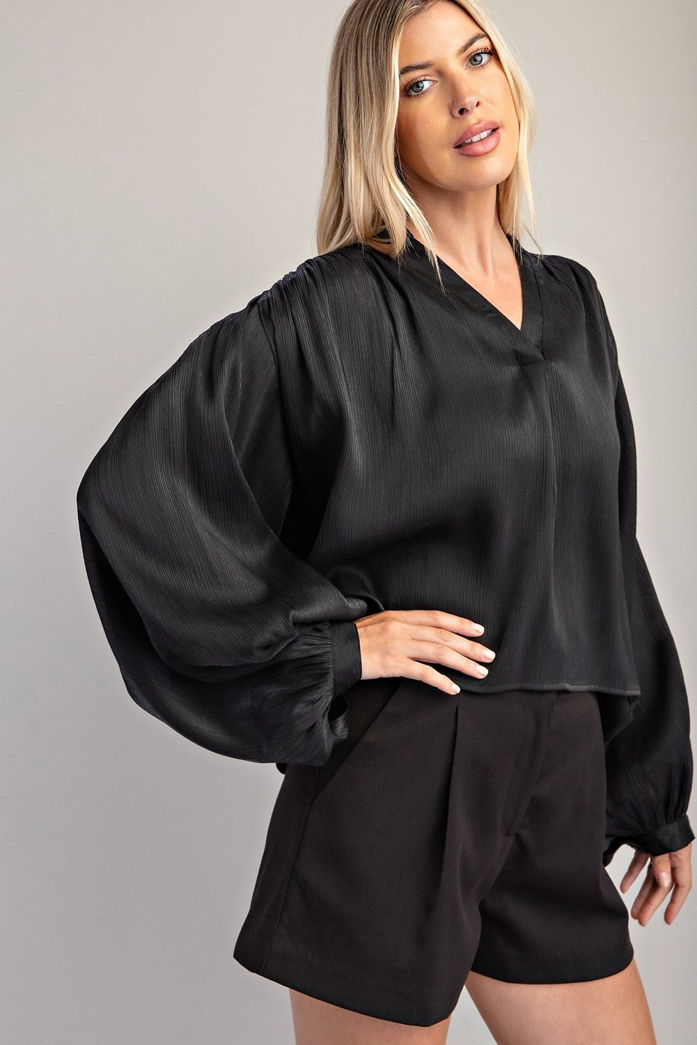 Enhance your wardrobe with the Evie Top! This stunning black blouse features balloon long sleeves for an effortlessly flowy look. Perfect for any occasion, this top will elevate your style and keep you feeling confident and chic. Don't miss out on this FINAL SALE, get yours now!