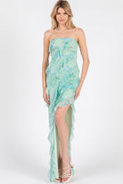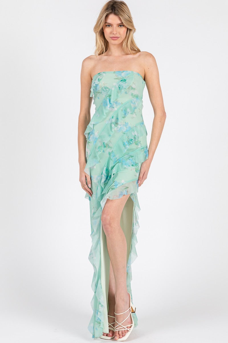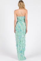 The Fernanda Maxi Dress in Sage brings whimsical charm with its strapless, off-shoulder style that turns heads. Playful ruffled layers cascade down, creating a romantic, flowing vibe that dances with every step. Its asymmetrical hem adds a fun twist, combining high-low flair with lightweight fabric that feels like a breeze on your skin. The fitted bodice hugs your shape just right, making this dress a delightful choice for effortless elegance anytime.