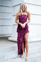 Introducing the Fernanda Maxi Dress! This exquisite strapless and sleeveless velvet dress features a stunning floral design with a diagonal ruffle detail. With a high side slit and side zipper, it's both elegant and practical. Make a statement at your next special occasion with this show-stopping maxi dress!