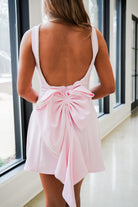 Introducing the Francine Mini Dress! This solid a-line silhouette sleeveless dress exudes elegance and sophistication. The beautiful open back is adorned with pearl embellished trim detail, adding a touch of luxury. Complete with a back skirt bow detail, this dress is perfect for any special occasion.