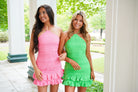 Indulge in the feminine and flirty style of our Harper Mini Dress! This stunning dress features a sleeveless, strapless design with a halter style neckline, enhancing your curves with a fitted bodycon silhouette. The delicate crochet lace adds a touch of elegance, while the ruffle tiered skirt hem creates a playful and romantic look. Complete with an open back, this dress is perfect for any special occasion.