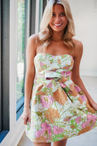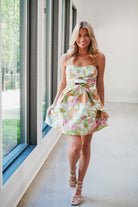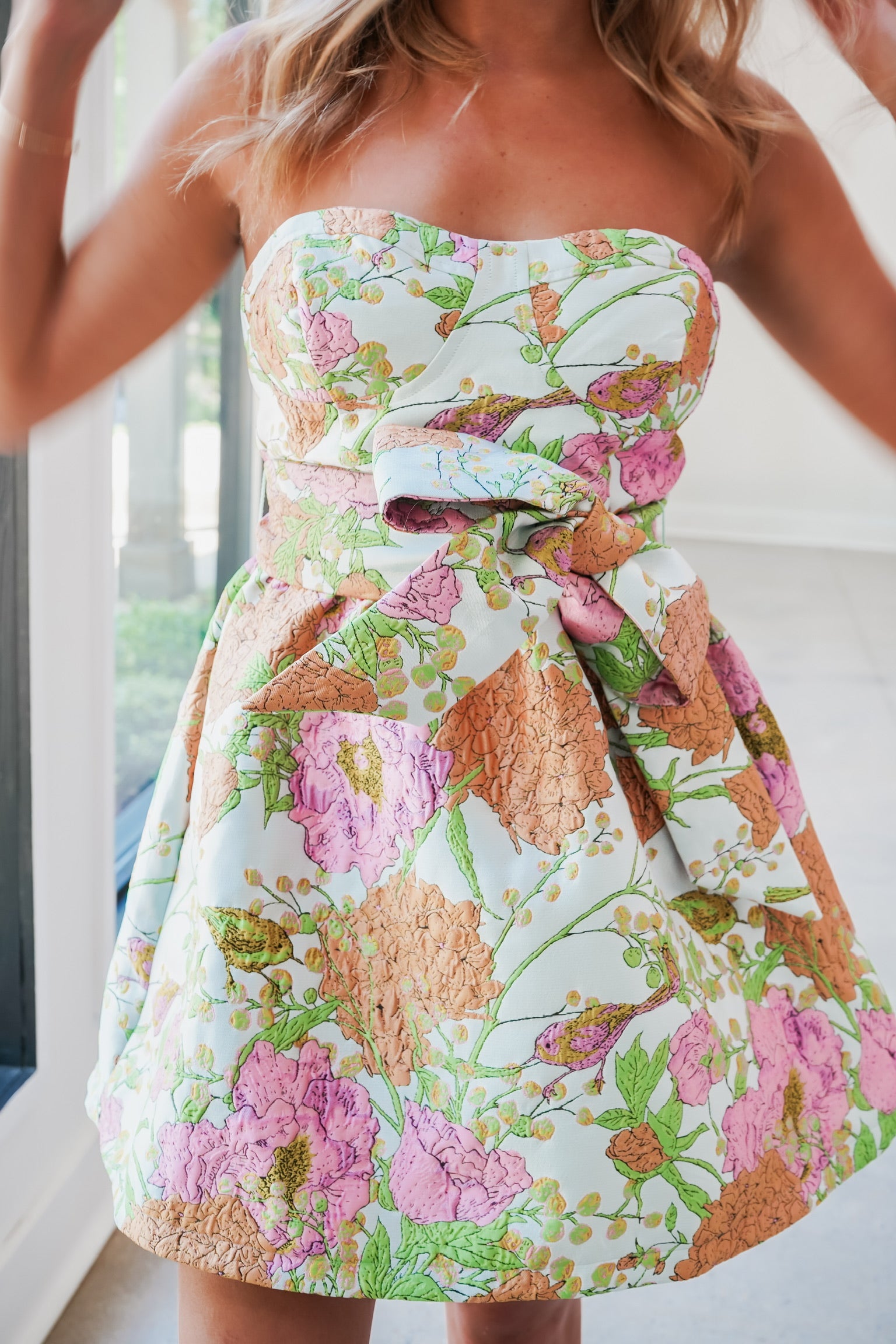 Feel like a goddess in our India Mini Dress! This sage, pink, and green floral brocade dress features a stunning textured print, a flattering strapless sweetheart neckline, and a flared skirt with a charming bow waistline. Perfect for any occasion, this dress will make you stand out and feel confident.