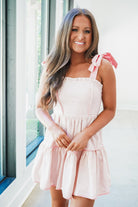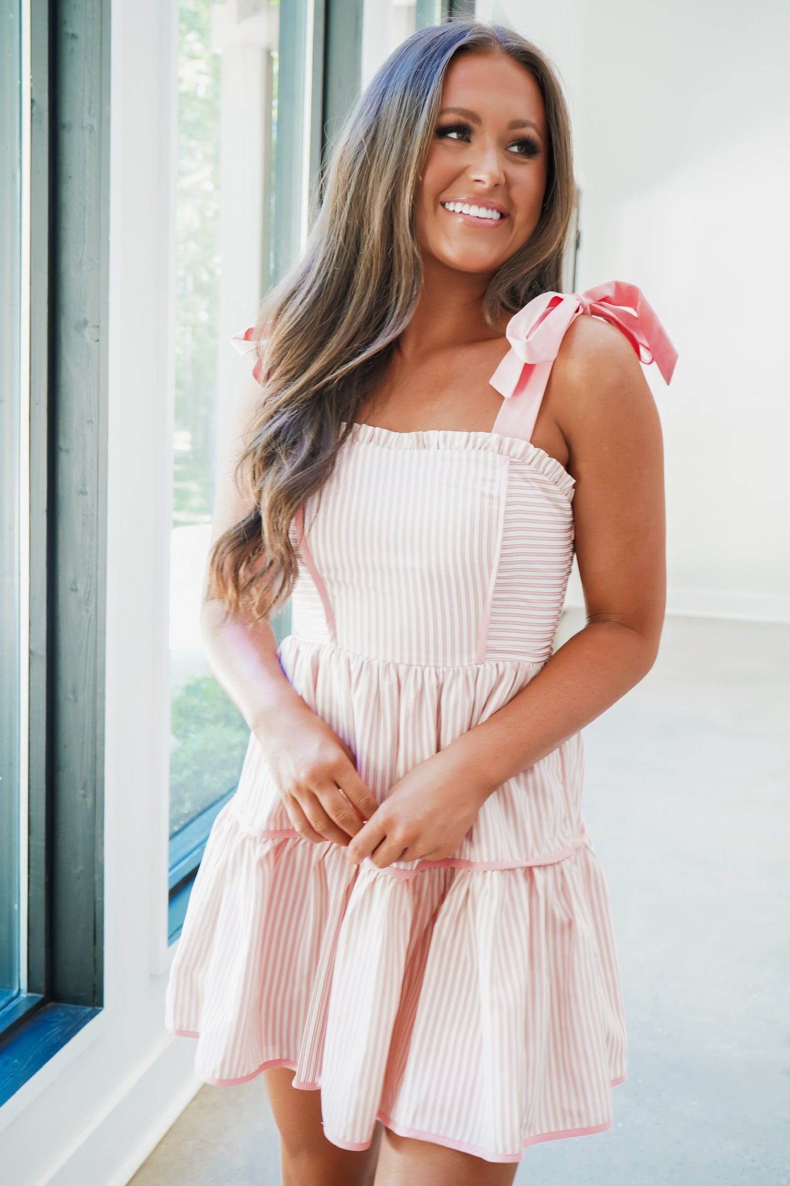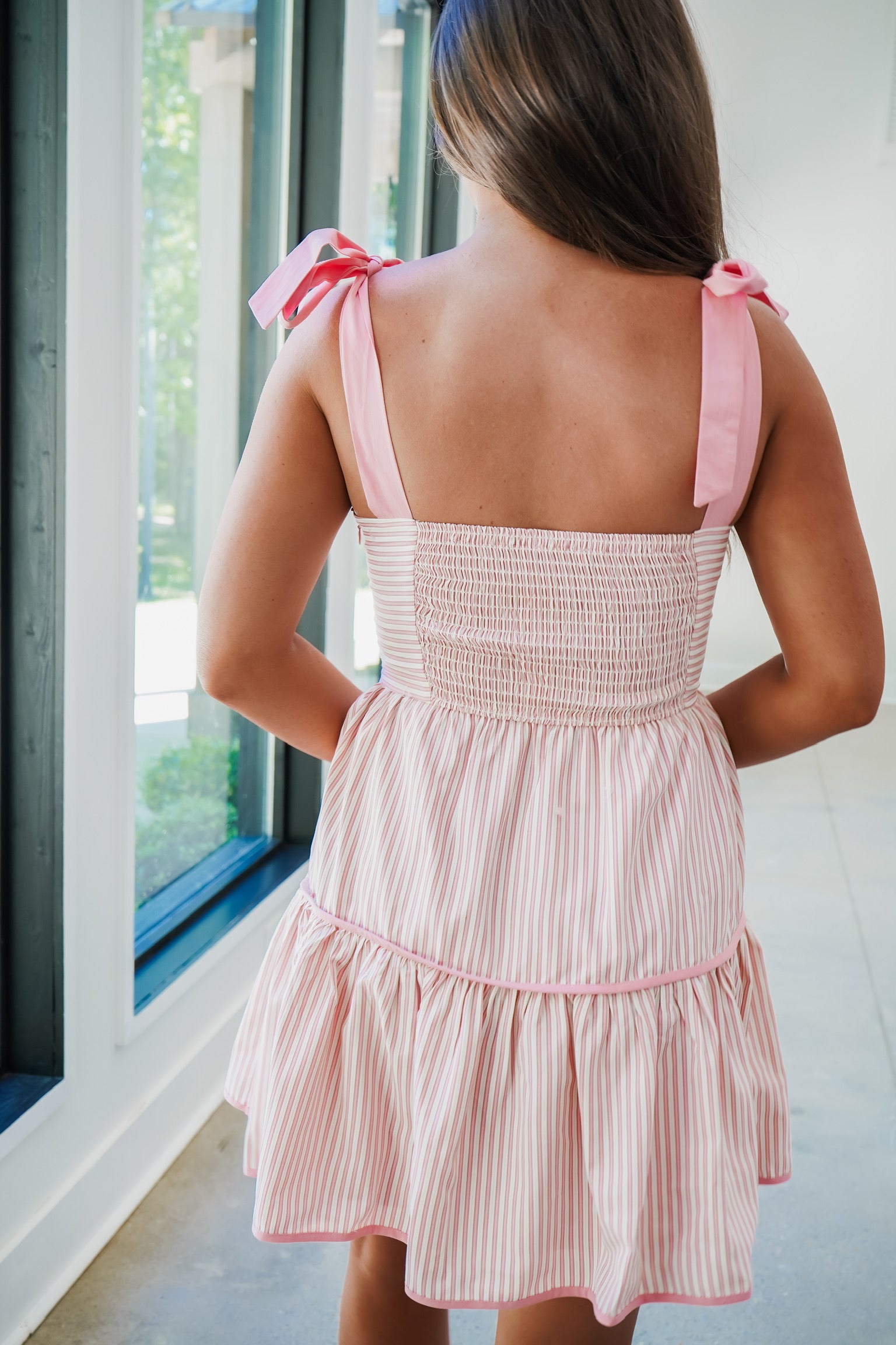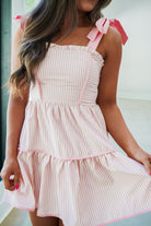 Add some fun to your wardrobe with our Issey Mini Dress! This pink and white seersucker stripe dress features satin ribbon tie straps, a ruffle hem, and a smocked back panel for a comfortable fit. The square neckline and pink trim add a playful touch. Perfect for summer days (and nights)!