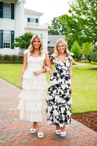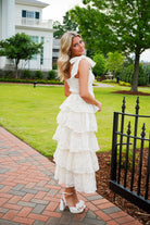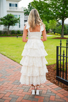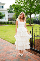 Elevate your style with our Jacquelyn Midi Dress! This elegant ivory dress features delicate flower embroidery, feminine bow shoulder straps, and a flattering bustier cup bodice. The smocked back panel ensures a perfect fit for every body type. Feel confidently beautiful in this tiered midi dress.