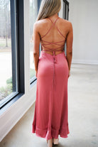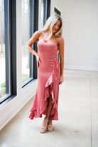 Be the belle of the ball in the Jenny Maxi Dress! This stunning, strapless satin dress features a strappy back closure and a high ruffle side slit for a touch of sass. Perfect for any formal event, this dress is sure to turn heads and make a statement. (No one will be able to take their eyes off you!)