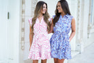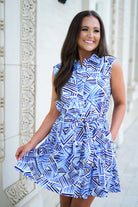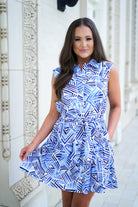 Get ready for summer in style with the Josie Dress! The vibrant blue and white geometric print will turn heads while the fold over pleat detail and waist tie belt flatter your figure. The full front button closure makes it easy to slip on and the ruffle tiered skirt adds a playful touch. Feel confident and chic in this sleeveless mini dress.