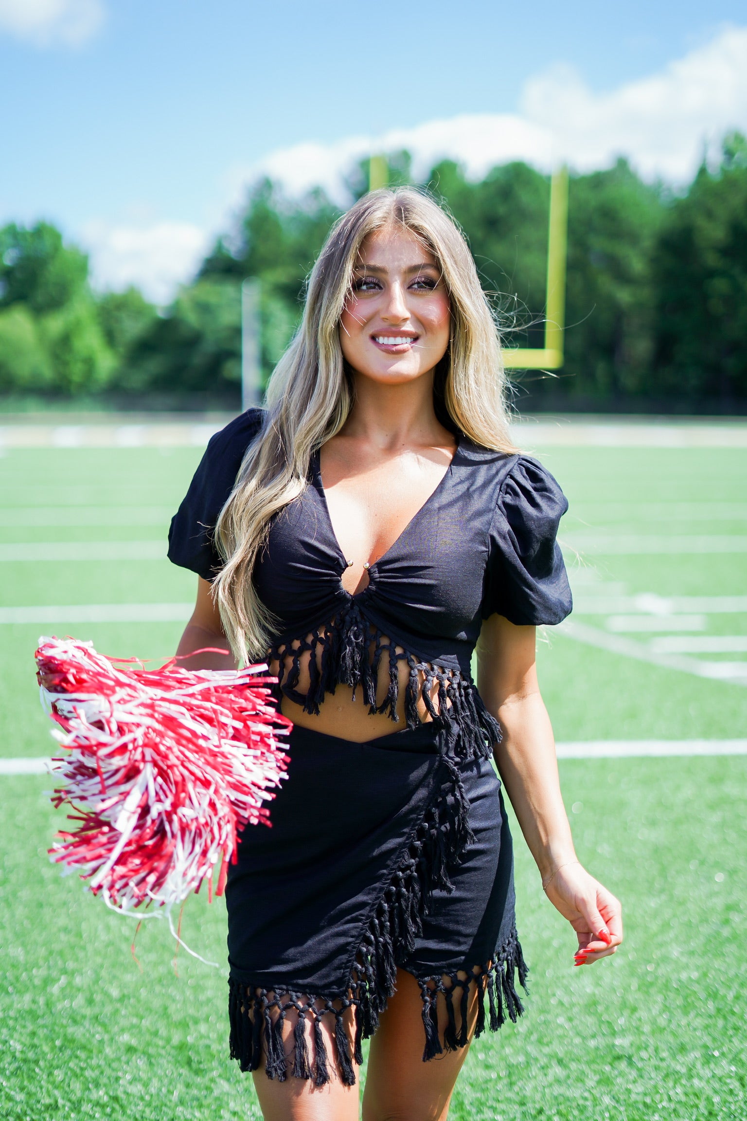 Elevate your style with the Kambrie Set! This sophisticated and chic two-piece set features a black linen fabric with playful fringe tassel trim. The short sleeve crop top boasts stunning puff sleeves and an o-ring bodice detail, while the wrap asymmetrical hem skirt adds a touch of modern flair. Upgrade your wardrobe and turn heads in the Kambrie Set!