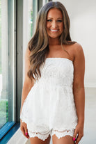 Get ready to rock the off white Katy Set! This two piece set features a playful strapless crochet lace peplum tube top and matching shorts. Embrace your fun and quirky side with this must-have addition to your wardrobe. (No one said style has to be serious!)