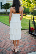 Turn heads in our Kei Midi Dress! This solid ivory dress features an accordion pleated strapless and sleeveless design with a tiered ruffle midi skirt and sweetheart neckline. Perfect for any occasion, this dress will make you stand out and feel confident in your style.