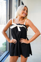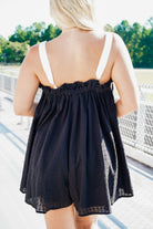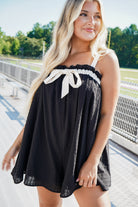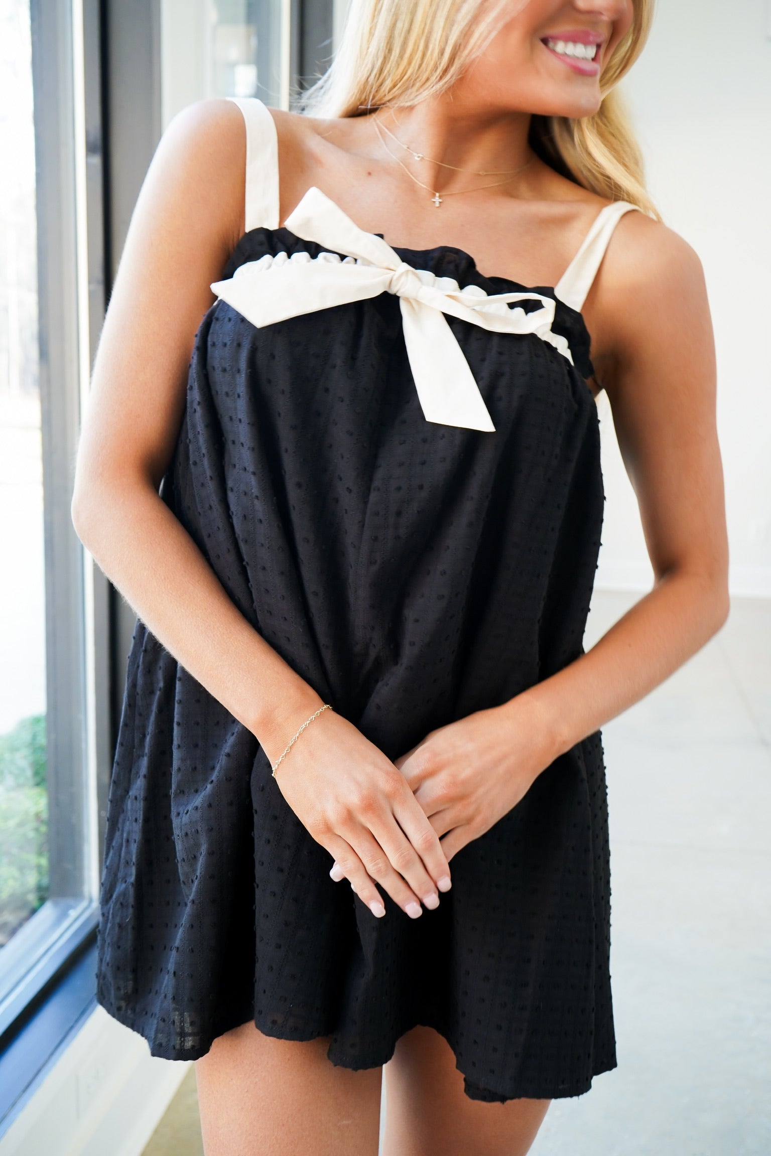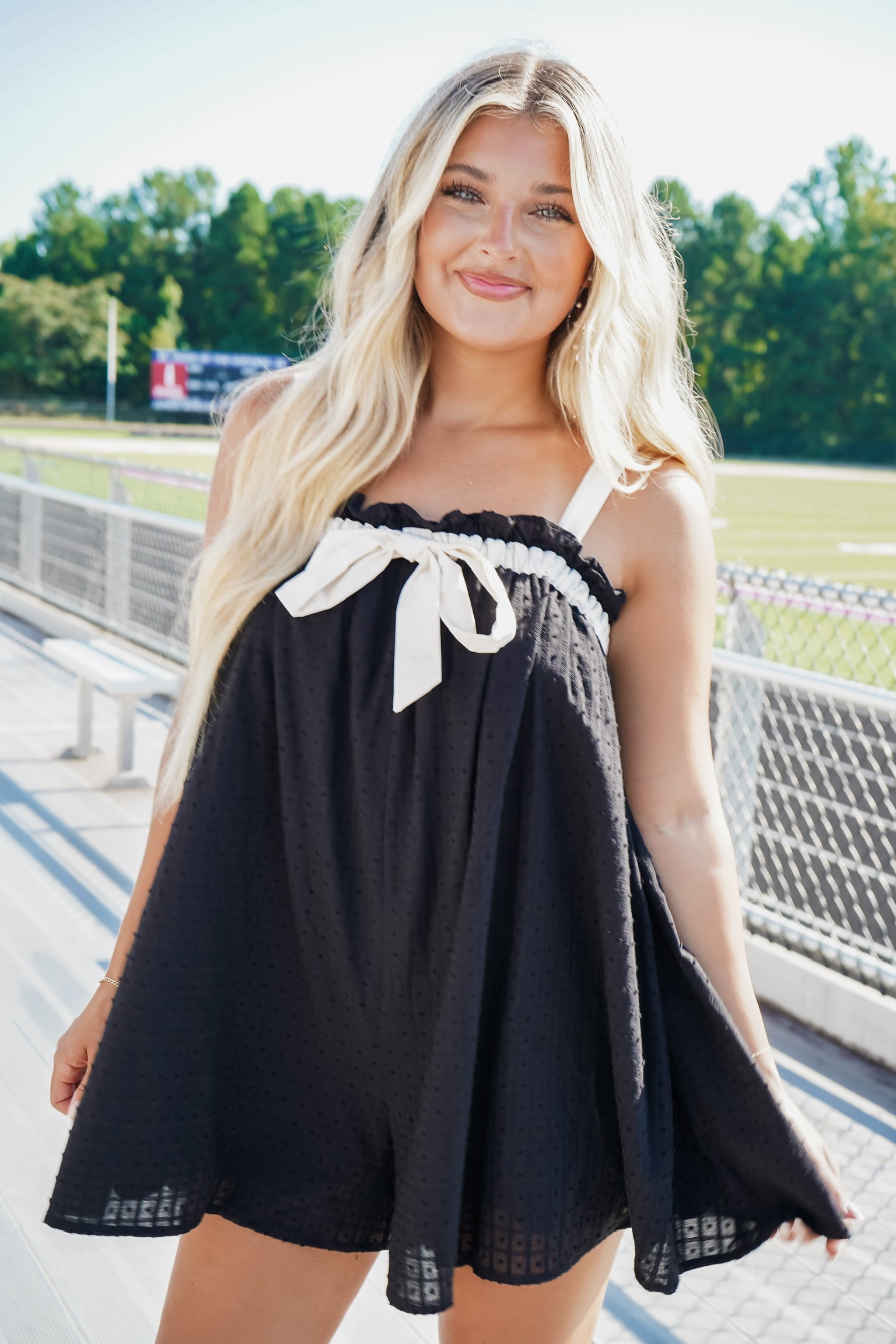 Get ready to romp in the playful and stylish La Lune Romper! Featuring a sleeveless, oversized design with swiss dot fabric and ribbon shoulder straps, this romper is both comfortable and chic. The ruffle hem and cream ribbon bow add a touch of whimsy while the square neckline and back keep things sophisticated. Perfect for any occasion!