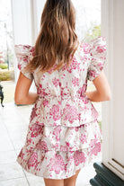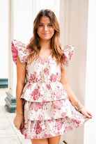 Take a twirl in the Luann Mini Dress! This metallic jacquard dress features a playful floral print, ruffle flutter sleeves, and a tiered skirt. With a shimmer of silver and pop of fuchsia pink, this dress will make you stand out at any party!