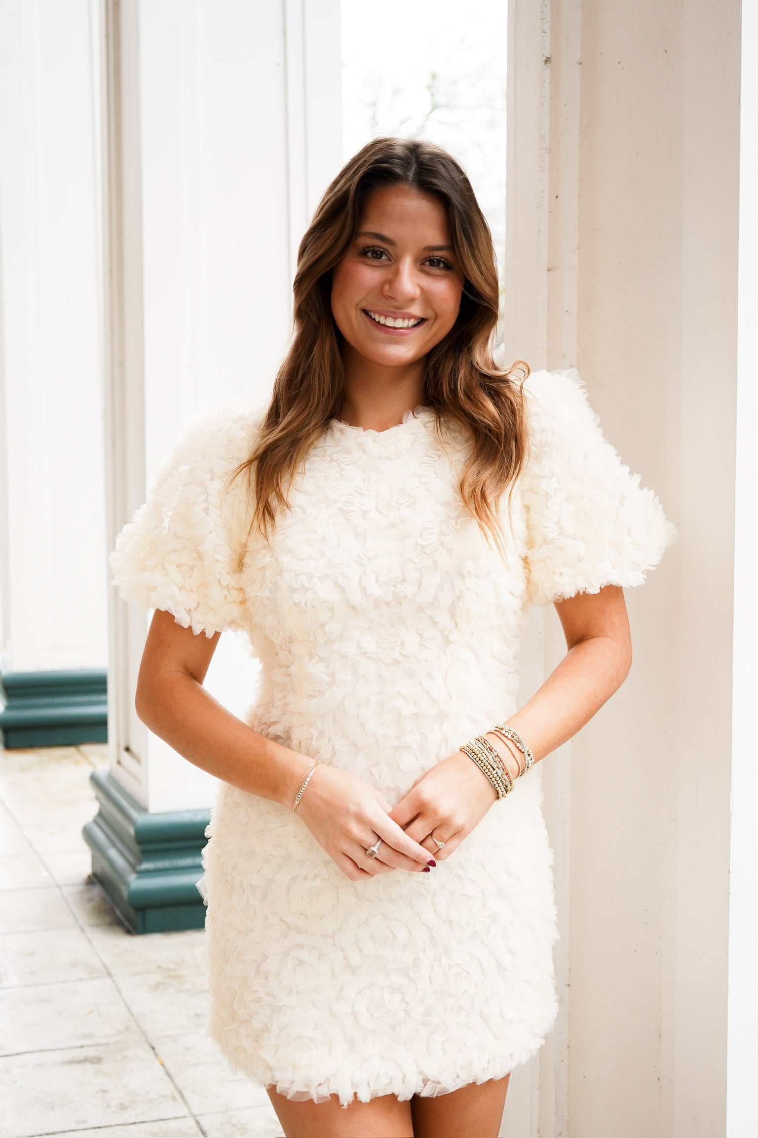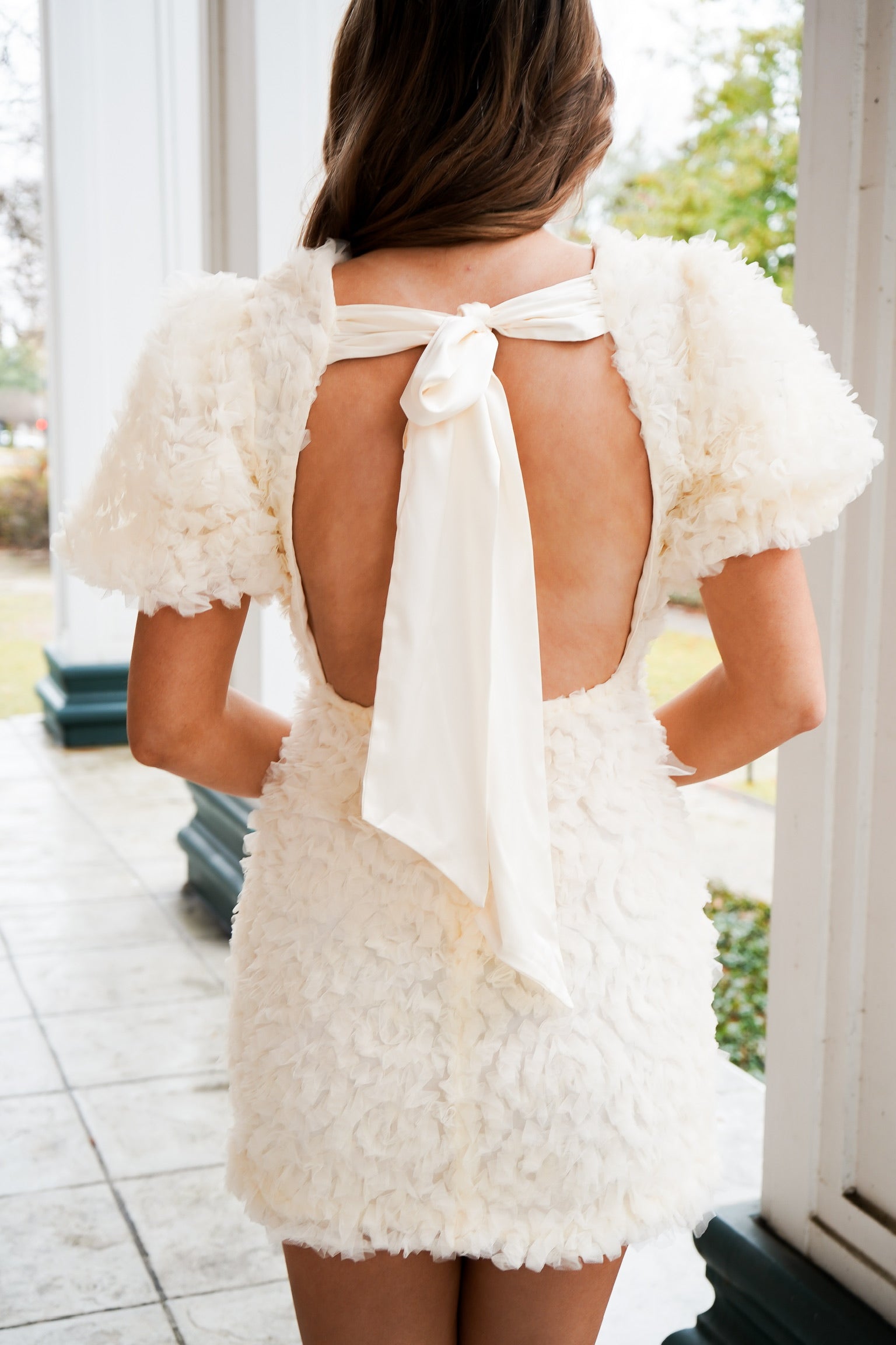 Get ready to turn heads in our Luna Mini Dress! Featuring a textured rose floral puff applique, this playful shift dress adds a touch of whimsy to any occasion. The puff sleeves add a feminine touch while the open back with bow closure detail adds a hint of allure.