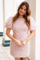 Get ready to turn heads in our Luna Mini Dress! Featuring a textured rose floral puff applique, this playful shift dress adds a touch of whimsy to any occasion. The puff sleeves add a feminine touch while the open back with bow closure detail adds a hint of allure.