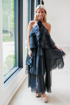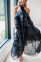 Twirl into elegance with our Marina Maxi Dress! This playful black chiffon creation features enchanting tiered ruffles that dance with every step. The flirty halter neckline showcases a delicate rose detail, while the strapless, sleeveless design and open back add just the right amount of daring charm. Perfect for making unforgettable entrances!