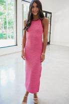 Turn heads in the Nat Maxi Dress, featuring a playful pink and brown horizontal stripe print with sleek black trim. This sleeveless bodycon knit dress hugs your curves while keeping things fun and flirty. Perfect for sunny days or casual nights out, it’s a vibrant twist on classic comfort.