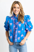 Make a statement in the Paloma Top, featuring a beautiful blue poppy print. The ruffle and puff sleeve details add feminine flair. Elevate your wardrobe with this must-have piece!
