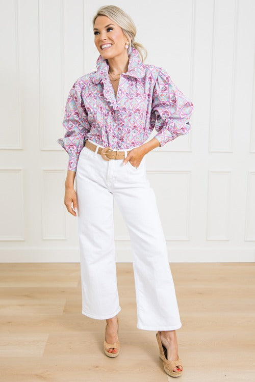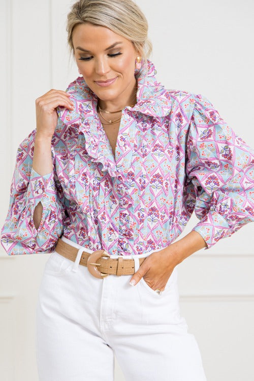 Introducing the must-have Paris Top! This stunning top features our best-selling blue and pink floral print, adding a touch of elegance to any outfit. With its flattering v-neckline and delicate ruffle detail, you'll feel confident and chic all day long. Don't miss out on this wardrobe essential!