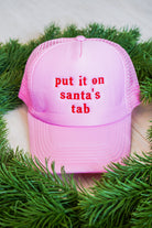 Get in the holiday spirit with our "Put It On Santa's Tab" Hat! This custom SOUTH staple is the perfect addition to your festive wardrobe. With an adjustable baby pink trucker hat and embroidered slogan in red, you'll spread holiday cheer wherever you go!