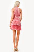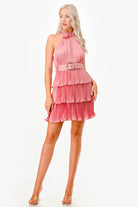 The Ren Mini Dress in pink brings a playful charm with its halter neck and flower corsage detail that beautifully frames the neckline. Crafted from pleated satin, its tiered layers add a flirty, twirling effect with every move. Complete with a matching belt and a back zipper for a perfect fit, this dress is ideal for making a fun and stylish statement at any event.