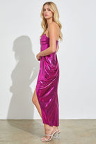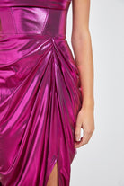 Step into the spotlight with the Rorie Midi Dress in vibrant berry purple metallic. Its sleeveless, strapless design combined with a corset-structured bodice beautifully shapes your silhouette, while elegant drape details add a touch of whimsy. The daring high side slit keeps your look playful and flirty, perfect for turning heads at any event. Embrace fun, flair, and a little sparkle all in one stunning dress.