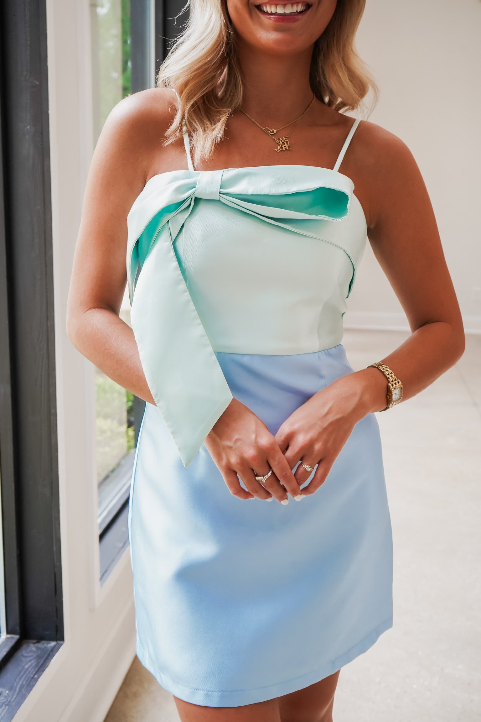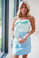 Twirl into summer with our Sariah Mini Dress! This playful piece features a refreshing mint green and blue chambray fabric that's perfect for sunny days. The adjustable shoulder straps ensure your ideal fit, while the eye-catching two-tone taffeta bow at the front adds a delightful finishing touch. Dress it up or down for any warm-weather adventure!