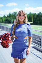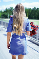 Transform your wardrobe with the Sasha Dress! This denim mini dress features a pleated bodice, side waistband cut outs, and a flare ruffle skirt for a flattering silhouette. The open back and keyhole back details add a touch of sophistication. Elevate your style and turn heads with this must-have dress!