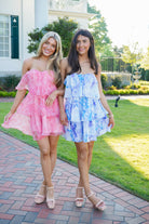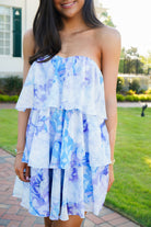 Get ready to turn heads in the Shira Dress! This playful mini dress features a blue and purple watercolor floral design, a strapless and sleeveless silhouette, and a flirty ruffle tiered hem. The open back and cut out detail add a touch of edge, while the back elastic strap ensures a comfortable fit. Perfect for any occasion, this dress will have you feeling confident and chic.