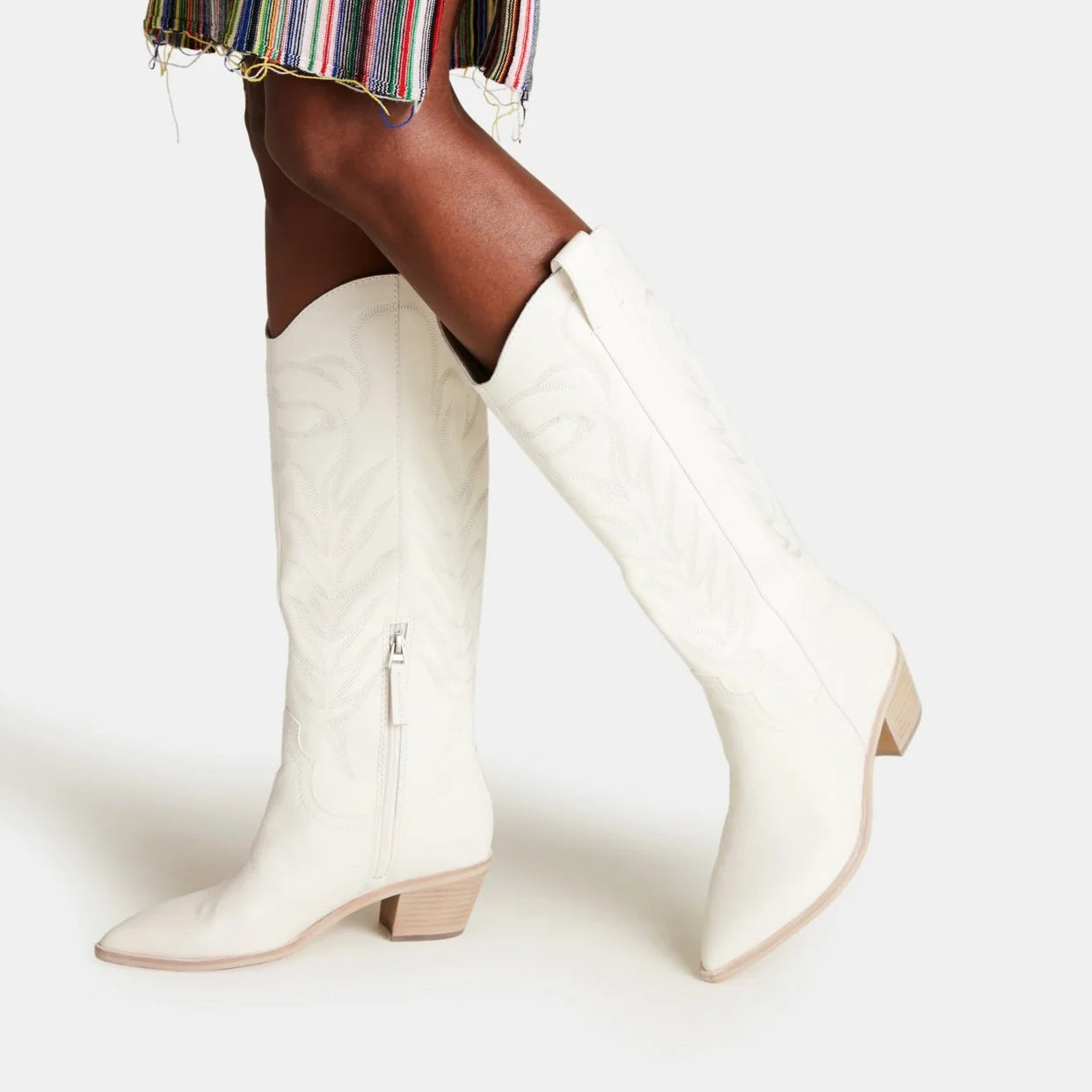 Meet your new favorite classic: the Solei Off White tall cowboy boot! Standing tall with that timeless cowboy silhouette, these boots bring a playful twist to any outfit. Whether you're heading out for a day of fun or dressing up your look, their off-white shade adds a fresh, stylish touch. Perfect for adding a little country charm with a modern vibe, these boots will have you feeling confident and ready to kick up some dust in style.
