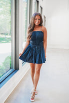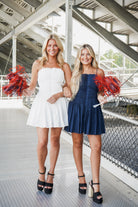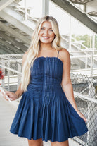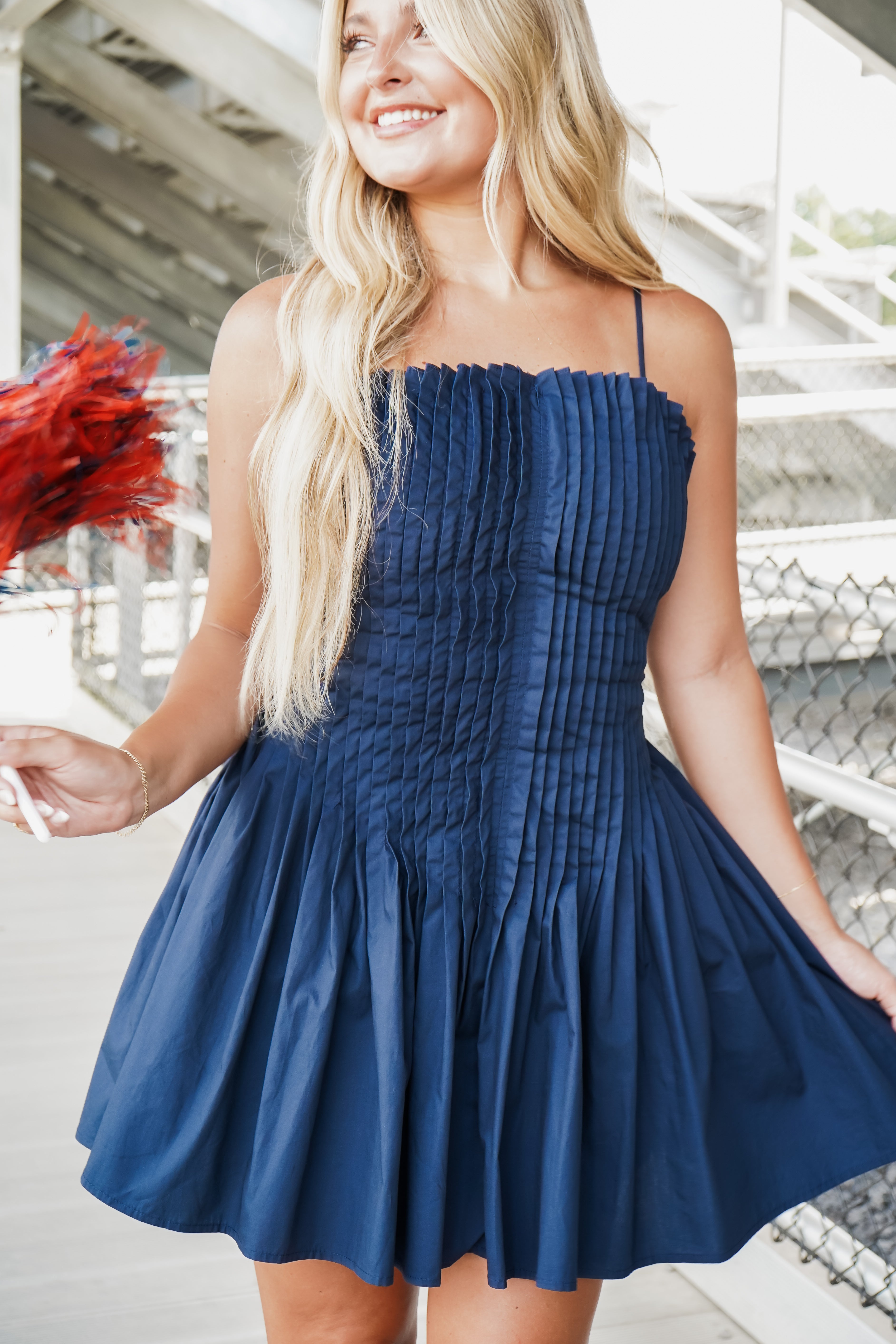 Twirl into any occasion with our Vasey Mini Dress! This navy blue stunner features playful accordion pleats that dance with every step. The fitted bodice and flared skirt create a flirty silhouette, while adjustable straps ensure your perfect fit. Zip up the back and you're ready to make memories—whether you're sipping cocktails or dancing until dawn!