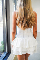 Unleash your inner romantic with the Weslyn Mini Dress! This charming dress features delicate bow detailing, a flirty pointelle ruffle, and a tiered embroidered skirt for a touch of whimsy. The scoop neckline and thin shoulder straps add a touch of elegance, making it perfect for any occasion. Embrace your feminine side with this must-have dress.