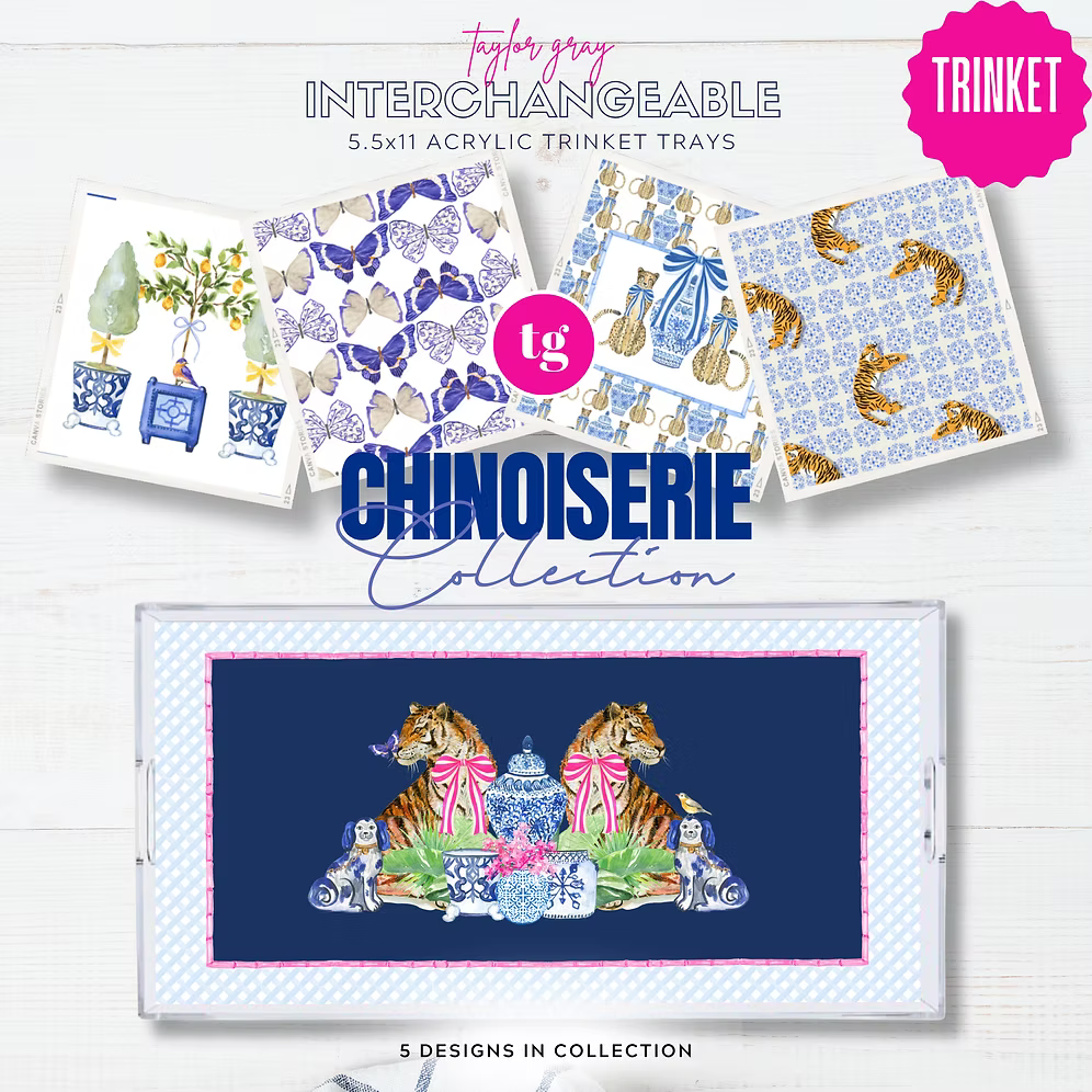 Acrylic trays are all the rage and are definitely on trend. Why should you settle for one design when you can have FIVE designs and change them out on a whim? The TAYLOR GRAY acrylic trinket tray is perfect and petite tray with a pocket on the bottom of the allowing the inserts to be easily interchanged and protected.